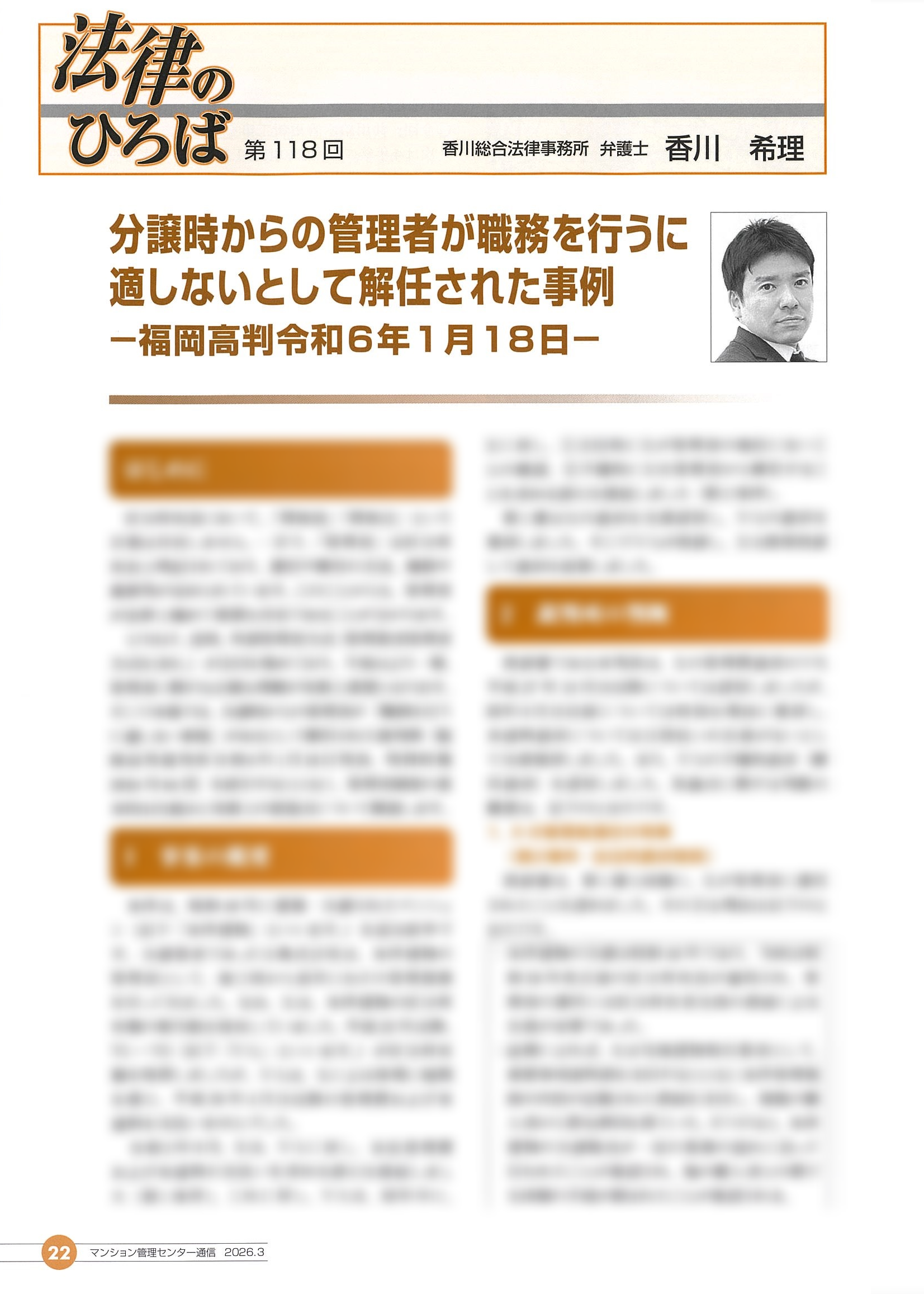 2026年3月に発行された『マンション管理センター通信』において、香川希理代表弁護士の執筆記事